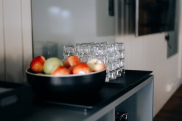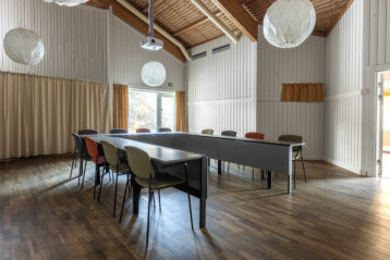 I samma hus som konferenssalarna finns ytterligare två konferenslokaler, fem grupprum och ett stort sällskapsrum med öppen spis. Kaffe serveras i sällskapsrummet och när det är dags för frukost, lunch eller middag tar ni en kort promenad till restaurangen i huvudbyggnaden.