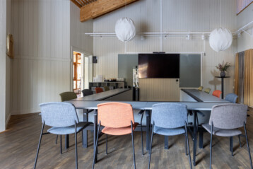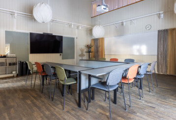 Kilen har en luftig känsla då takhöjden är mer än generös. precis som i E-salen så finns här whiteboard längs med en långsidan samt en stor 98-tums display för presentationer.